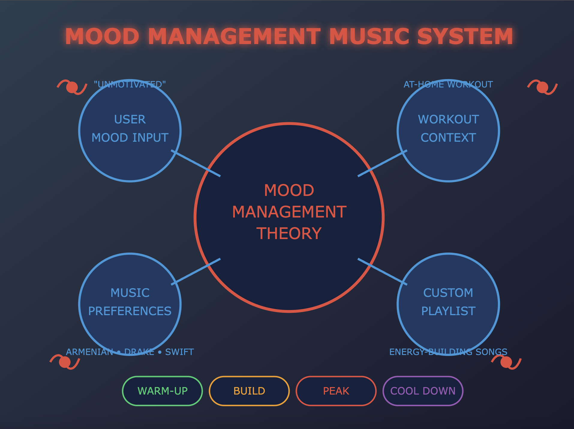 This approach would be much more sophisticated than current “workout” or “motivation” playlists because it would be personalized to your specific: - Current emotional state - Music preferences - Workout history - Response patterns to different music stimuli