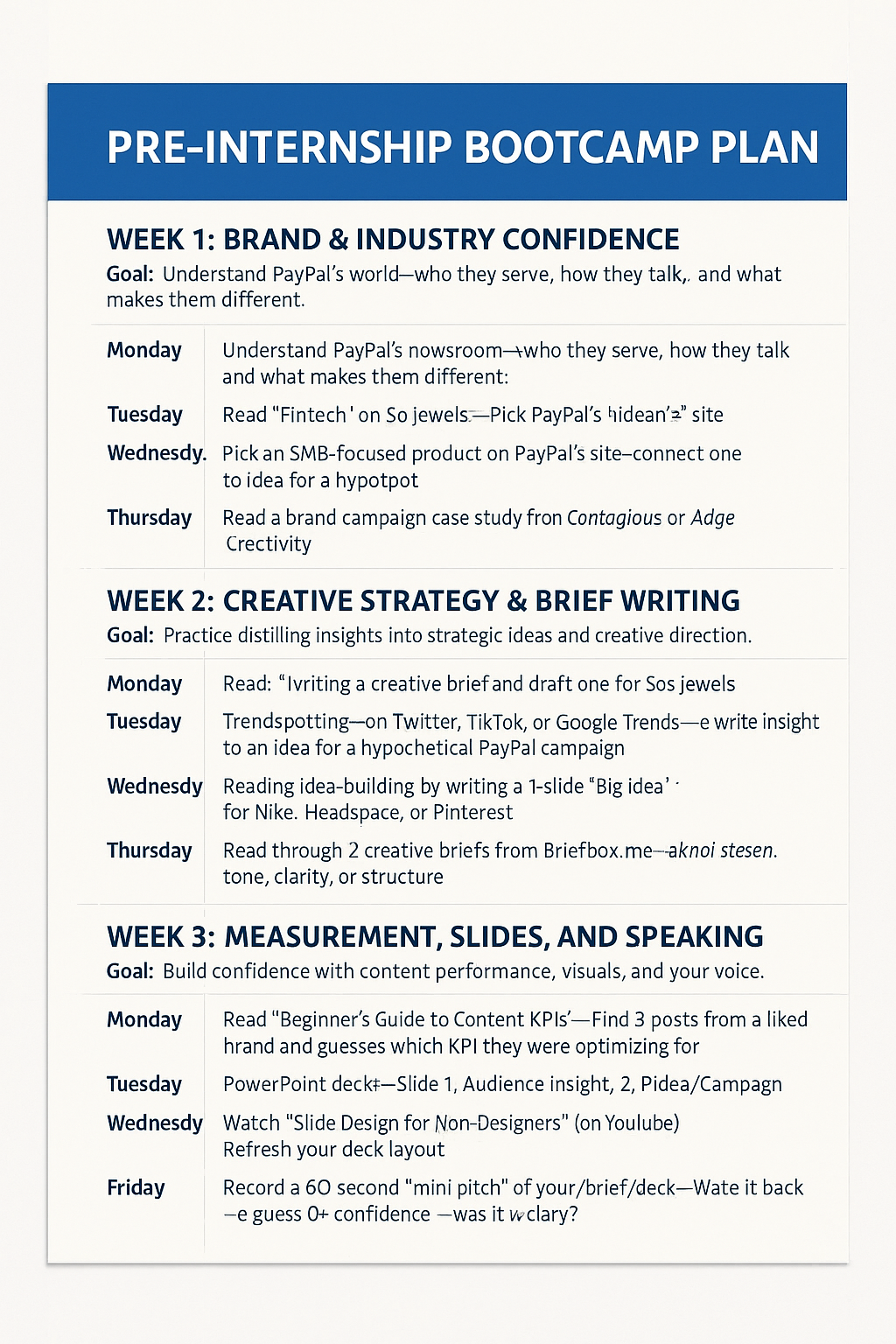 Let’s break it down so you feel more confident going in. Here’s a little pre-internship prep plan you can start now — and I can help with any of these: